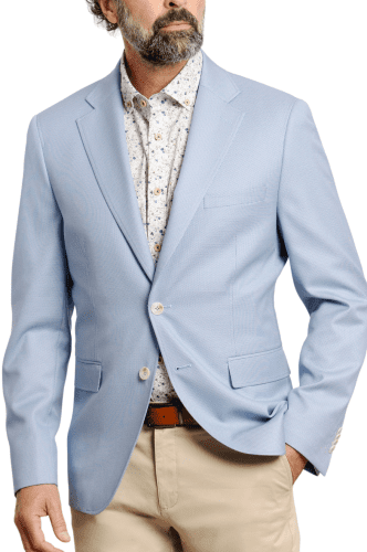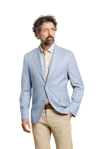 Cierre de dos botones a contraste, dos aberturas en la espalda. Bolsillos de tapeta, bolsillo cerillero.