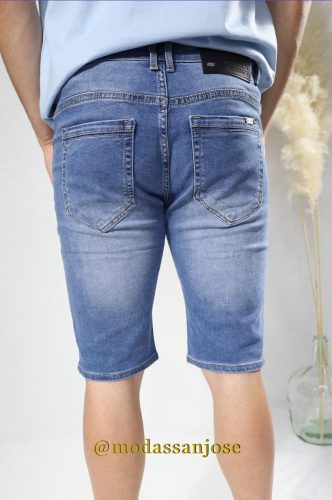 Short 6 bolsillos tejano elástico de estilo casualwear. De color azul MEDIO y de aspecto desgastado con cintura media.