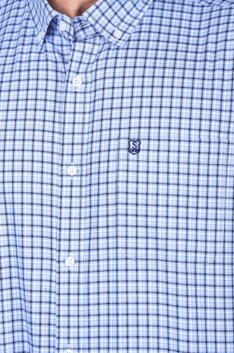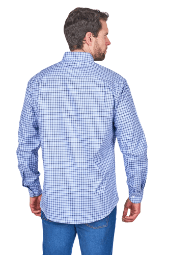 Su diseño presenta un patrón de cuadros finos en tonos azules, con cuello abotonado y cierre frontal con botones resistentes. Perfecta para llevar tanto con vaqueros como con chinos, aportando un look casual elegante y funcional.