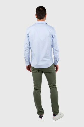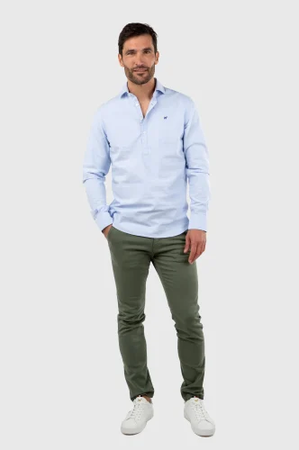 - Detalle de etiqueta bicolor marino y burdeos con escudo en el costado izquierdo.