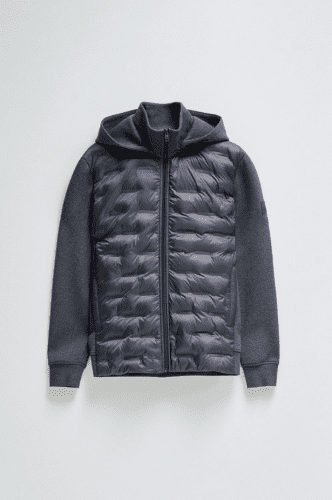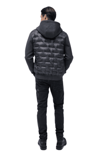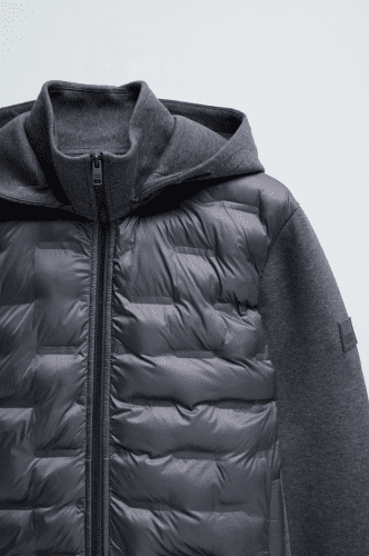 Cazadora acolchada con mezcla de materiales en las mangas. Con capucha.