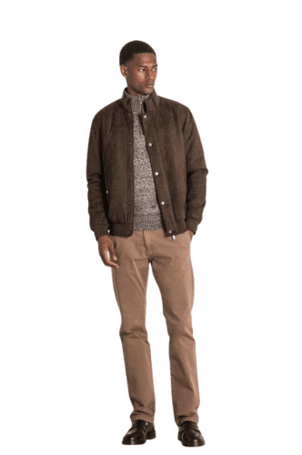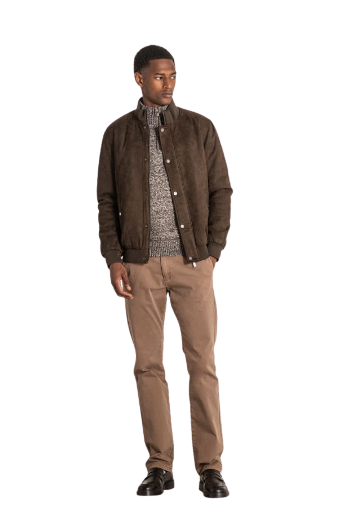 Elegante y versátil, esta chaqueta tipo bomber en acabado de antelina combina estilo clásico y modernidad. Su tono marrón oscuro la convierte en una prenda fácil de combinar, perfecta tanto para looks casuales como más sofisticados.