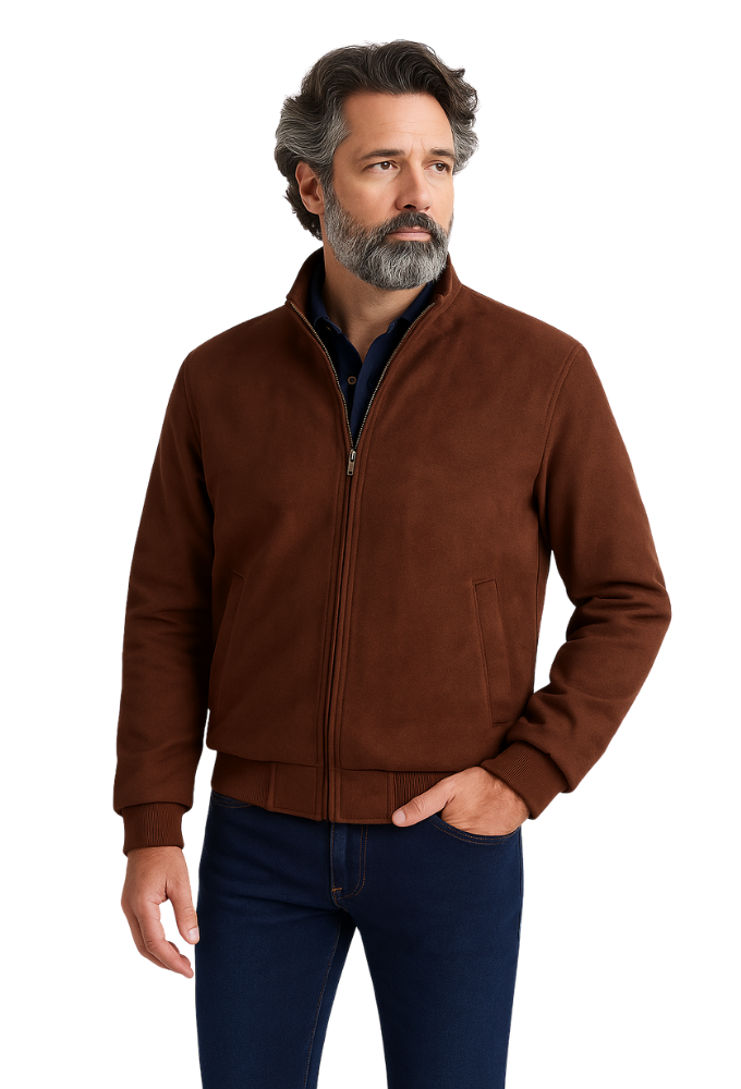 Esta cazadora marrón combina elegancia y confort en una prenda versátil y atemporal. Confeccionada en ante sintético de tacto suave, ofrece un acabado refinado que realza cualquier look casual o semi-formal.