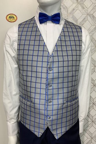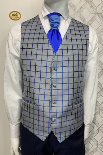 Chaleco de ceremonia fondo gris plata y dibujo de cuadro en azul klein, espalda lisa en raso negro.