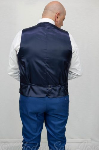 Chaleco de ceremonia de fondo blanco y diseño minicuadro en azul marino.