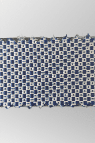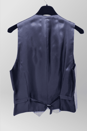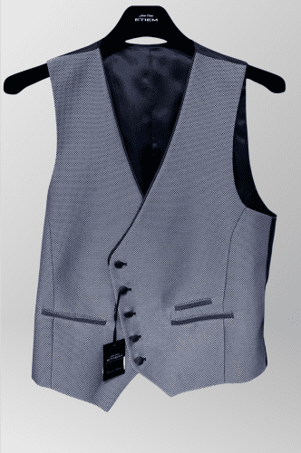 Chaleco de ceremonia corte cruzado, fondo blanco y diseño minicuadro en azul marino.