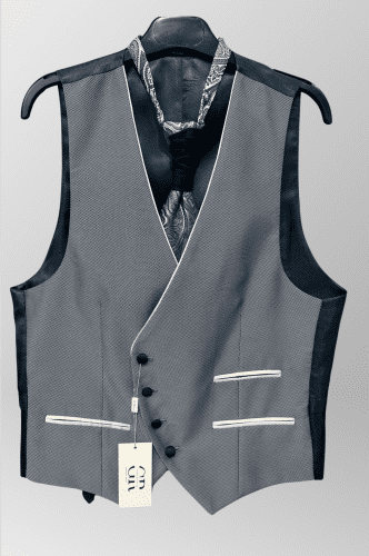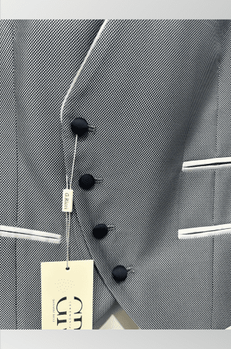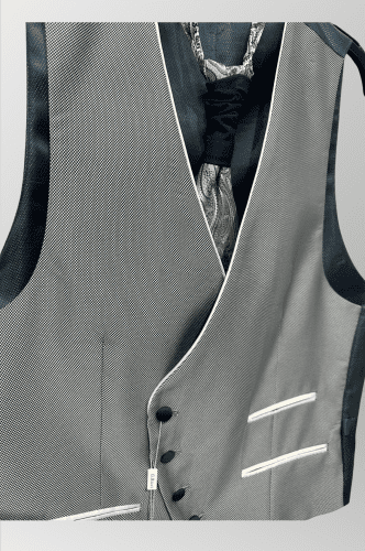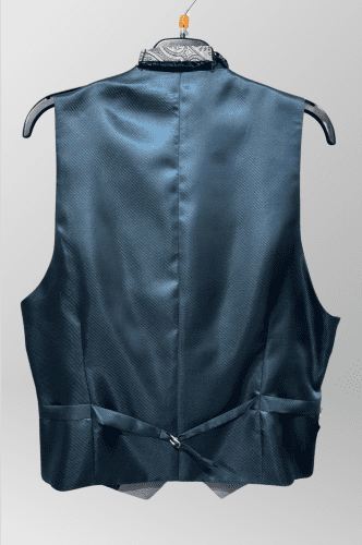 Chaleco de ceremonia corte cruzado, fondo azul y diseño minicuadro en plata.
