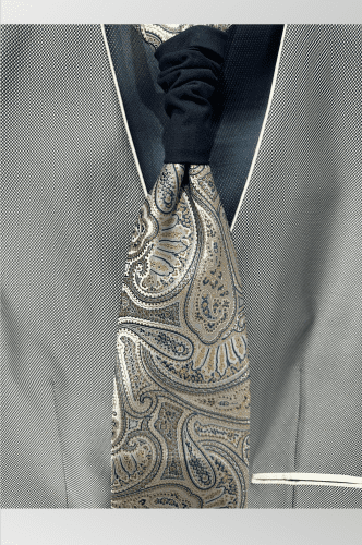 nudo en azul marino y pala en estampado paisley con colores plata, azul y cobre.