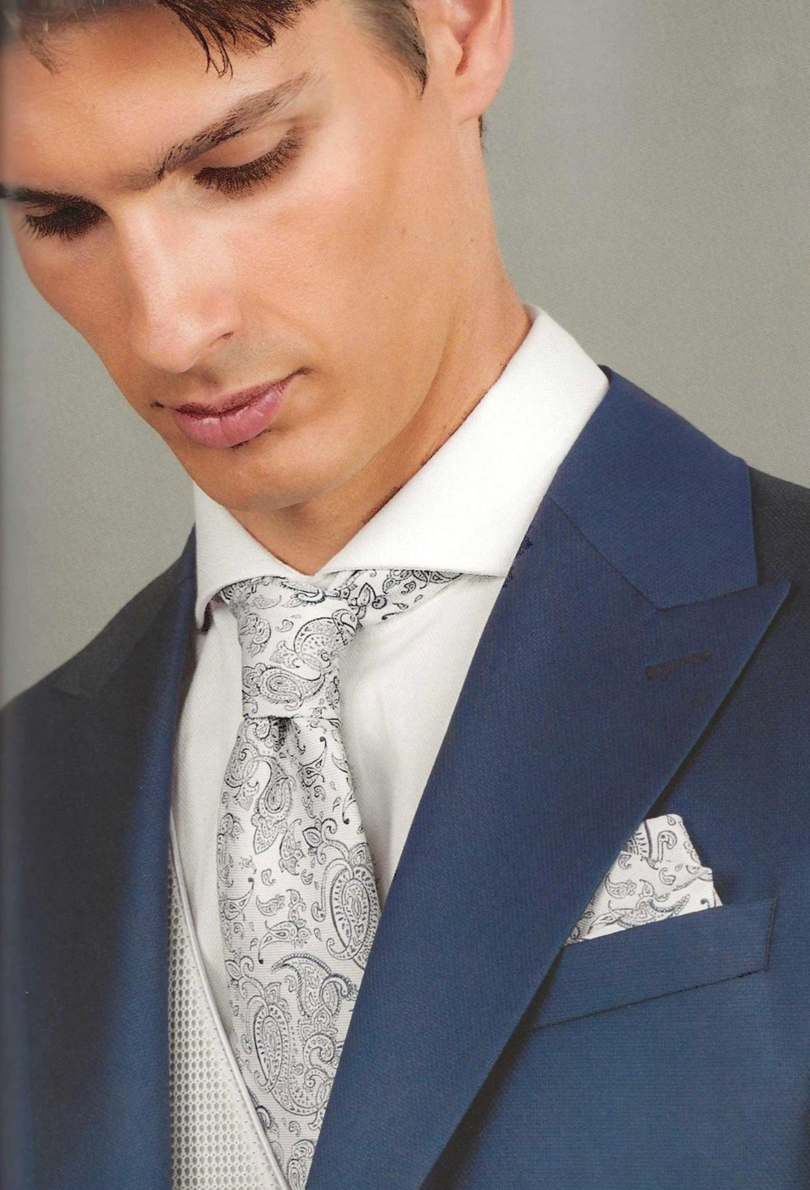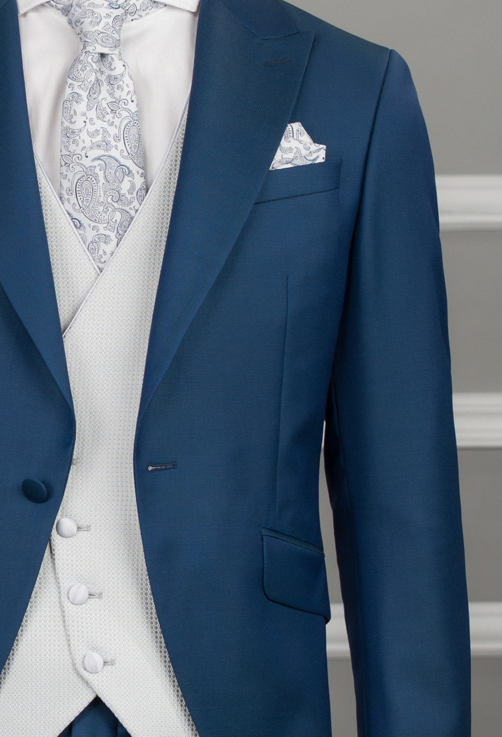 Confeccionado en 100% microfibra, ofrece un tacto suave, una excelente resistencia al uso y un acabado impecable durante toda la ceremonia. El tejido presenta una textura estructurada con microdibujo azul, que añade profundidad visual y un estilo refinado muy propio de la sastrería de ceremonia contemporánea.