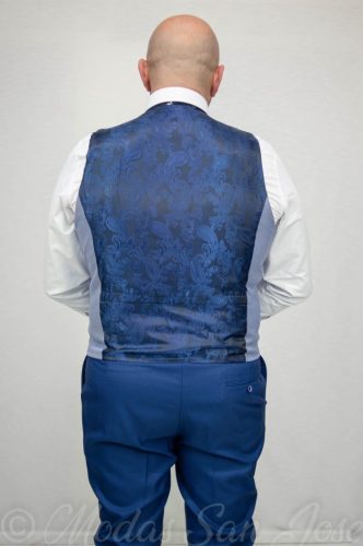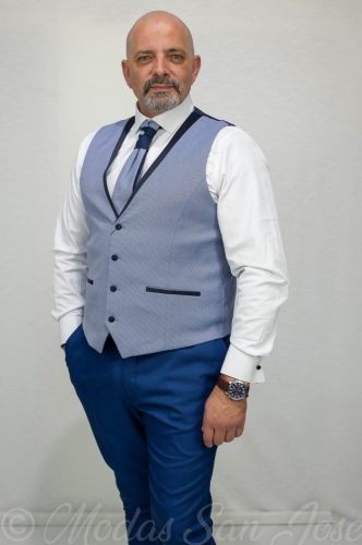 Chaleco de ceremonia fondo azul claro y dibujo punteado en azul marino , espalda en raso estampado marino.