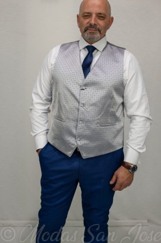 Chaleco corte recto fondo plateado y estampado de cuadros azules , botones forrados y falso bolsillo.