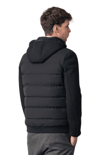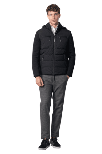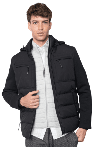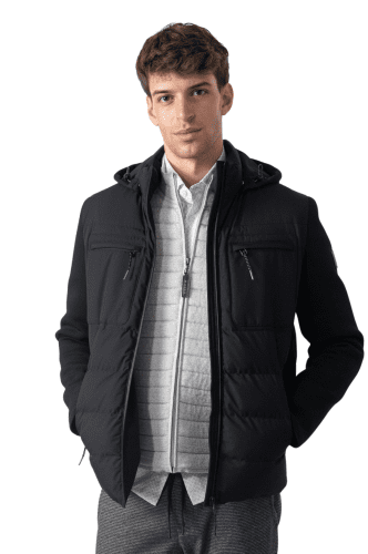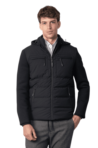 Chaqueta acolchada combinada de tejido técnico y punto `tipo foam´ en mangas y capucha desmontable.