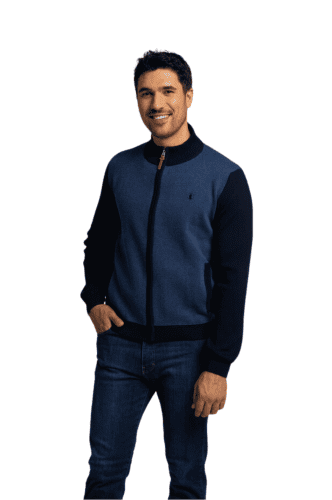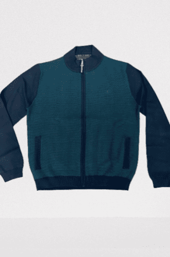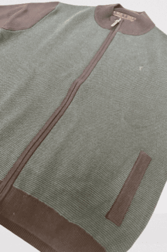 Chaqueta de cremallera con cuerpo en hilo verde y resto es color negro.