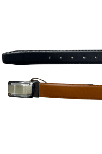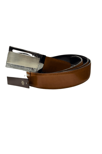 Cinturón de vestir en piel de vacuno reversible, por lo que se puede utilizar por ambos lados. Por un lado en color negro y por el otro en color marrón castaño.