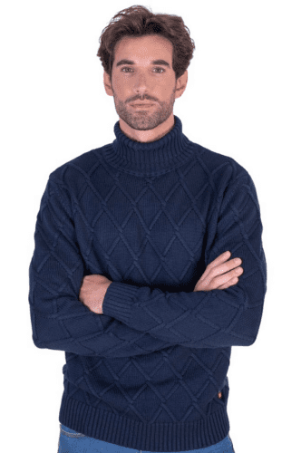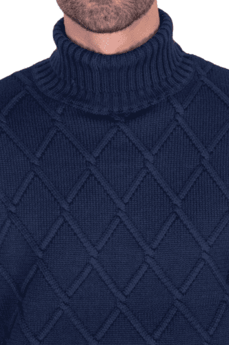 Descubre la elegancia y el confort en un solo diseño con este jersey de hombre de cuello alto en azul marino, confeccionado con un tejido cálido y suave ideal para otoño e invierno. Su patrón geométrico en relieve aporta un toque sofisticado y moderno, convirtiéndolo en una prenda versátil tanto para looks casual como para combinaciones más formales.