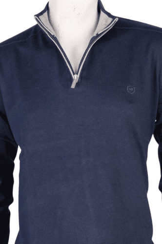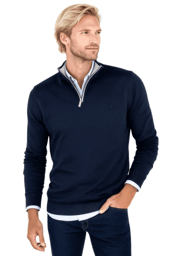 Eleva tu estilo con este jersey premium de punto fino en color marino, un básico imprescindible para cualquier guardarropa masculino. Su cuello de cremallera con detalle bicolor aporta un toque moderno y sofisticado, perfecto para vestir tanto en looks casuales como más formales.