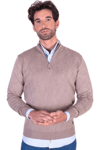 Este jersey de hombre tostado con cremallera 1/4 combina elegancia, comodidad y un diseño moderno pensado para el día a día. Su tejido presenta un patrón de rombos finamente marcado, aportando un estilo sofisticado que destaca sin ser exagerado.