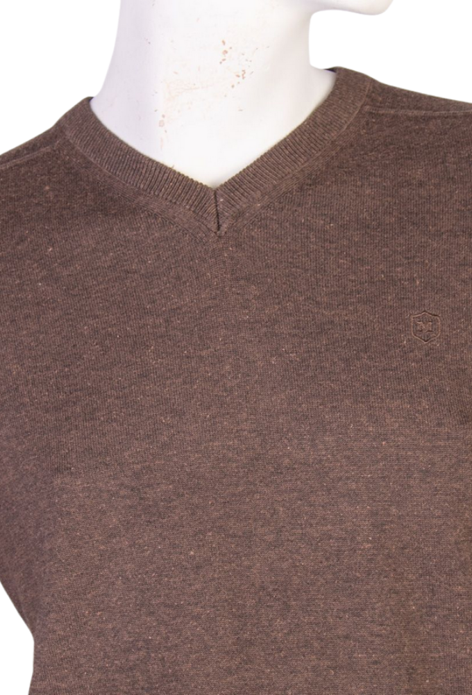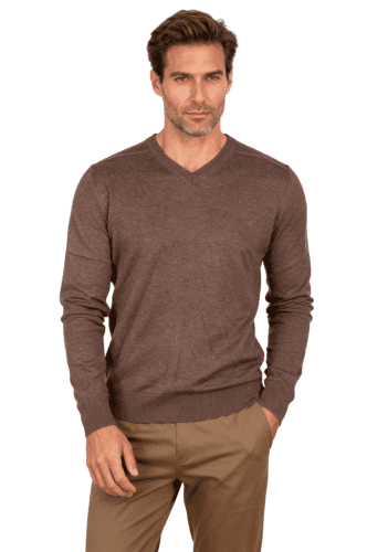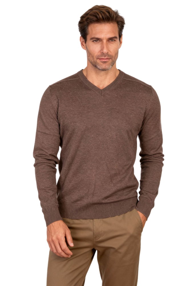 Este jersey de hombre marrón con escote pico es una prenda imprescindible básica, para quienes buscan elegancia, comodidad y versatilidad en una sola pieza. Presenta un tejido fino de tacto suave, perfecto para llevar solo o combinado con camisa para un look más formal.