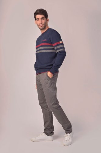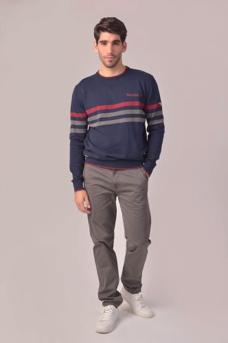 Siente el espíritu Privata con este jersey de punto de manga larga , listado gris y granate sobre fondo marino.