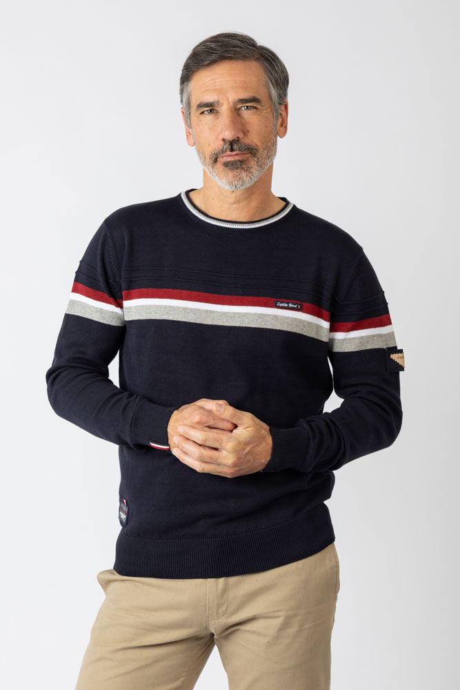 Siente el espíritu Privata con jersey cuello redondo, tejido confortable y agradable. Diseño combinando los colores marino, blanco y granate.