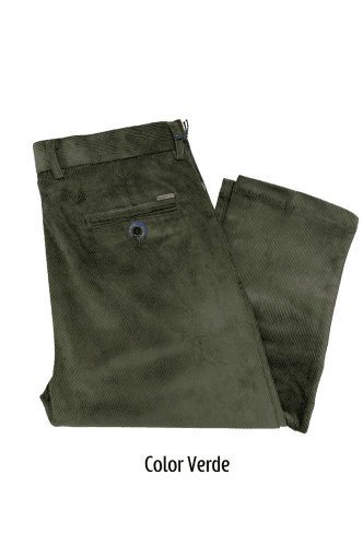 Pantalón de tipo sport en tejido de pana elástica de doce bordones. Confeccionado con bolsillo francés y dos bolsillos traseros rajados con botón y cierre con pretina prolongada con botón exterior y broche interior. También lleva bolsillo de relojera en la cintura. En el interior lleva forro de petrina estampada en motivos florales. Etiquetado en interior y exterior con nuestra marca Luiyi´s.