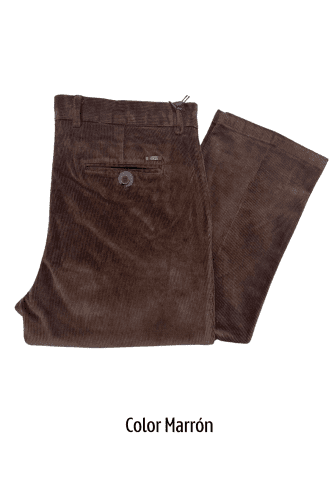 Pantalón de tipo sport en tejido de pana elástica de doce bordones. Confeccionado con bolsillo francés y dos bolsillos traseros rajados con botón y cierre con pretina prolongada con botón exterior y broche interior. También lleva bolsillo de relojera en la cintura. En el interior lleva forro de pretina estampada en motivos florales. Etiquetado en interior y exterior con nuestra marca Luiyi´s.