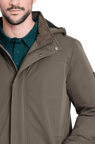 Su tono kaki atemporal se combina con un tejido técnico texturizado que realza la prenda con un acabado visual más sofisticado y un tacto agradable.