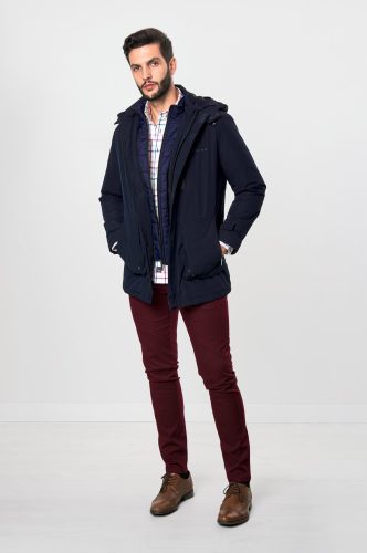 Cuenta con cierre central de cremallera y tapeta, dos bolsillos laterales, capucha y falso chaleco interior.