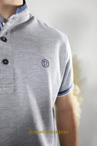 Polo de manga corta color gris vigore detalle de cuello mao y elásticos manga en color azul marino.