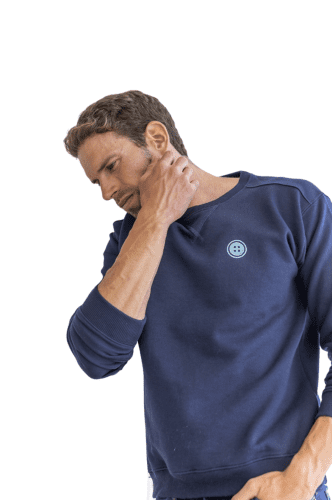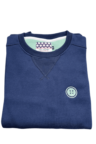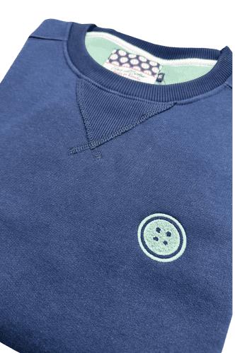 Sudadera basica con detalle de insignia de la marca, boton en color verde menta con relieve..