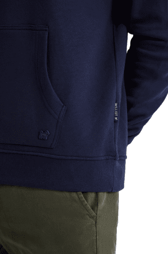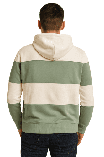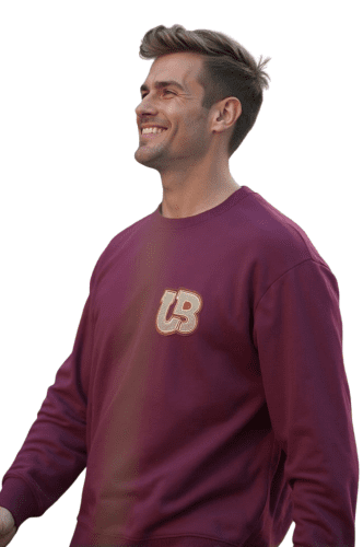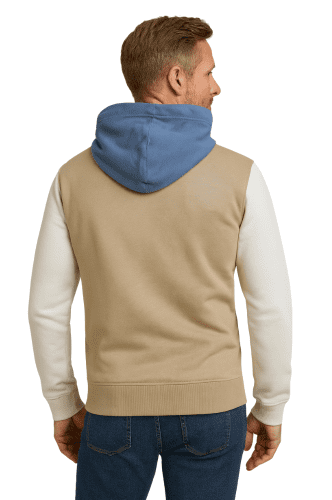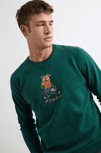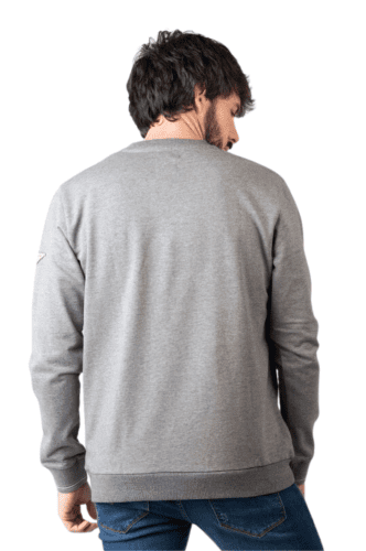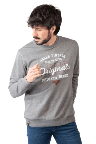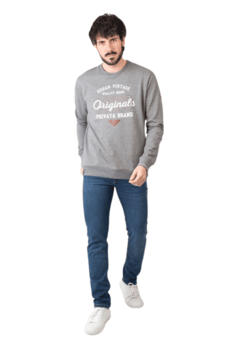 Sudadera con cuello redondo y tejido jaspeado suave, combinación gráfica estampada en el pecho.