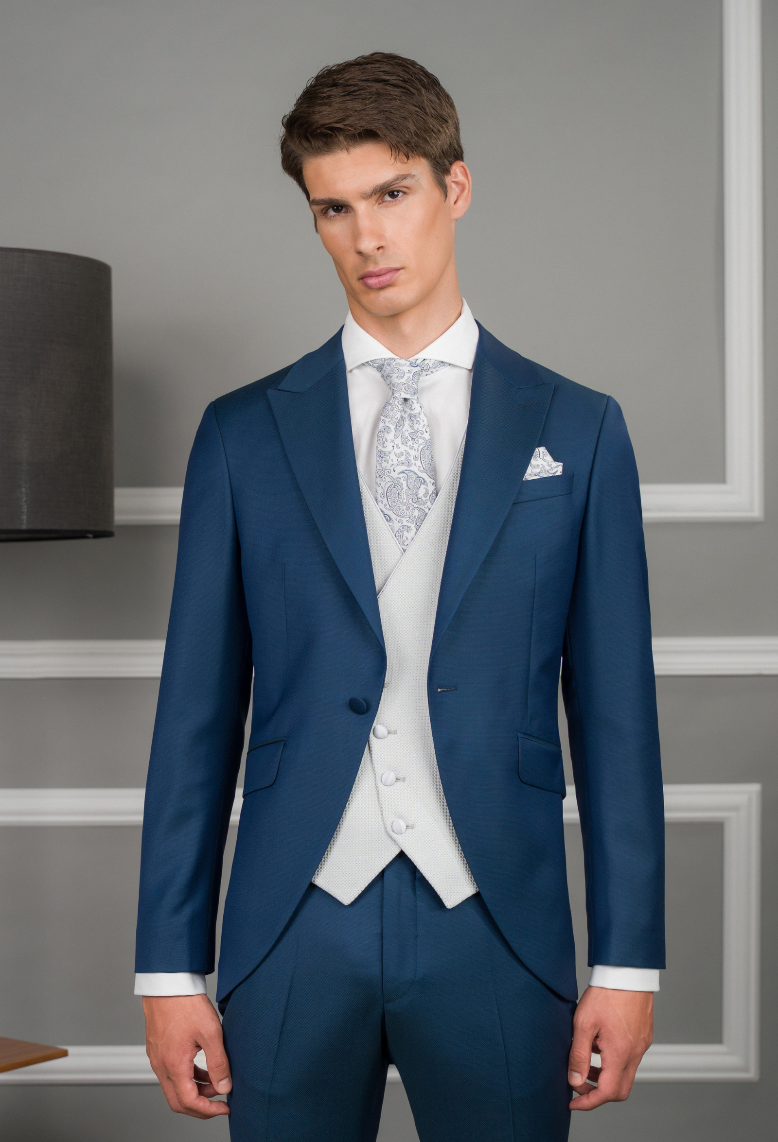 El intenso tono azul cobalto aporta personalidad y distinción al conjunto, manteniendo un equilibrio perfecto entre elegancia clásica y estilo contemporáneo. Se completa con chaleco a contraste en tono claro, que ilumina el look y refuerza su carácter ceremonial.