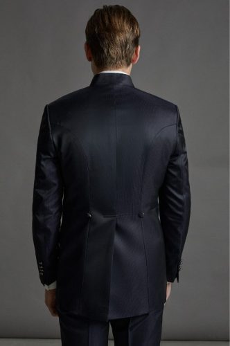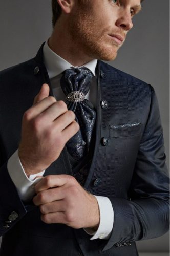 Traje de novio azul microdibujo en tejido acetato y lana. Americana con cuello mao, 1 botón que va en contraste con chaleco cruzado con espalda en tejido de 4×4 botones y corbatón y pañuelo.