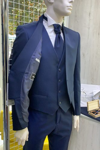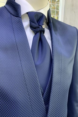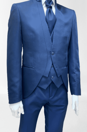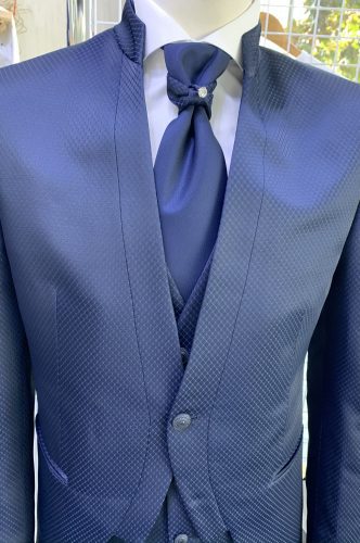 Traje de Novio chaqueta en corte levita con cuello mao abrochado de 1 botón en azul, tejido de levita estampado en azul haciendo dibujo de rombo y una abertura.