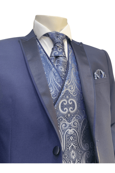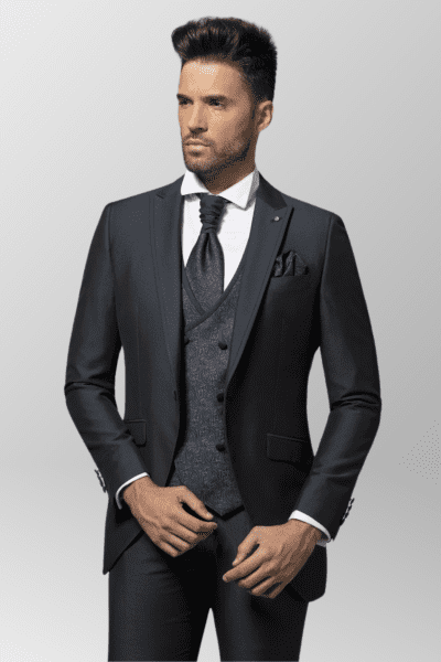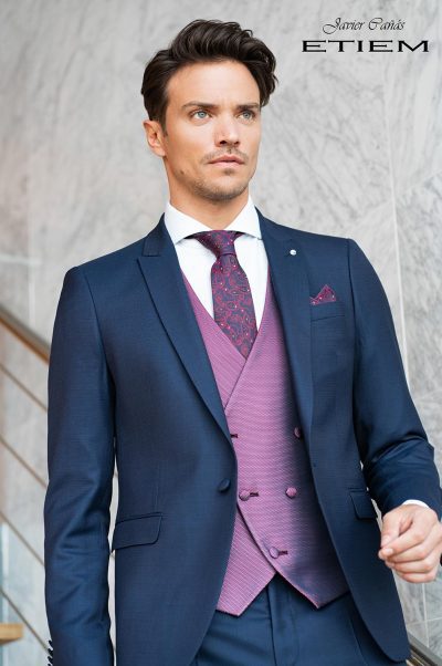 Diseñado para novios con personalidad, padrinos o invitados de alto nivel, este modelo combina la tradición de la ceremonia clásica con un toque contemporáneo que lo hace único. Su tejido satinado realza la presencia del conjunto tanto en interiores como en exteriores, ofreciendo una imagen refinada y con carácter propio.