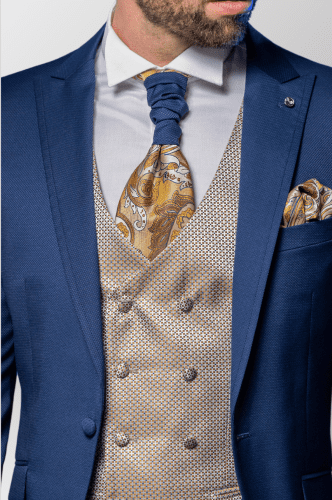 Traje de novio en color azul navy, diseño de tejido haciendo un falso liso en semibrillo.