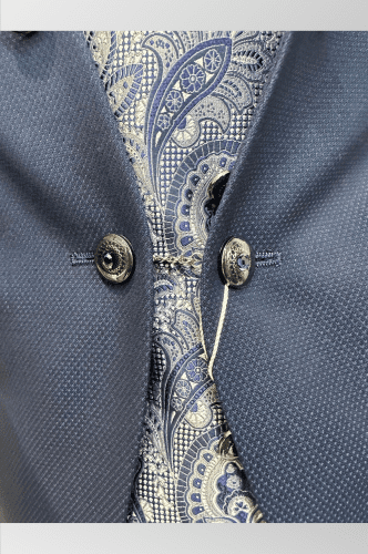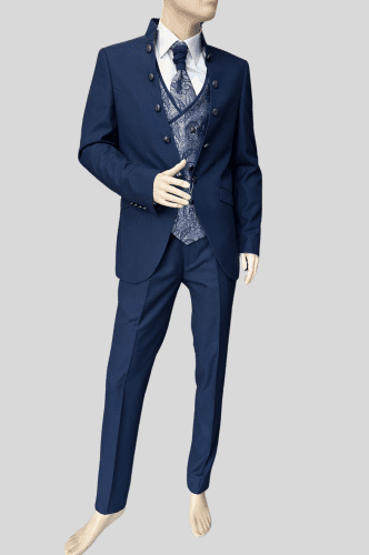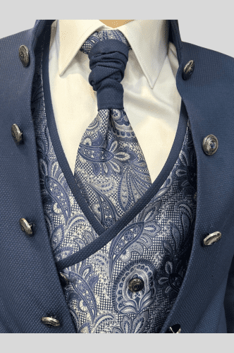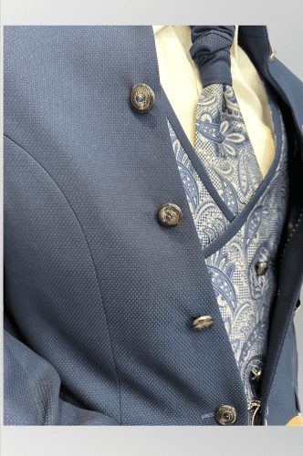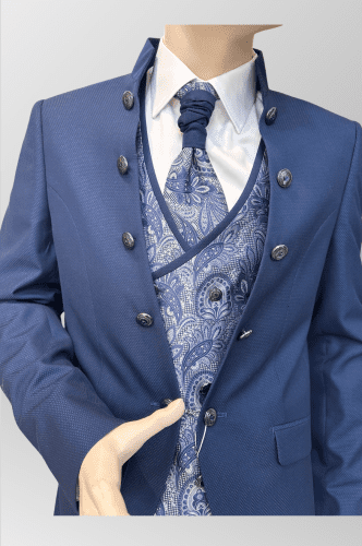Traje de novio en color azul, diseño de tejido haciendo un cuadrille en semibrillo.