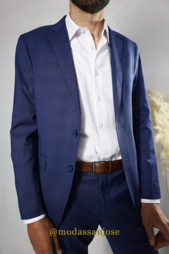 Traje corte strech realizado en cuadro azul marino con una pequeña raya azul sobre fondo azul tinta.