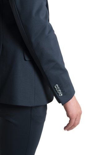 La chaqueta tiene una largo de 75cm para la talla 50. Forro entero con tres bolsillos. El pantalón es de tiro medio con cierre de cremallera y botón, un bolsillo trasero de ojal y sin pinza.
