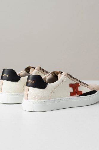 La marca Etiem va serigrafiada en el talón y el logo, recortado y cosido en el lateral, va en ante a contraste con la zapatilla.