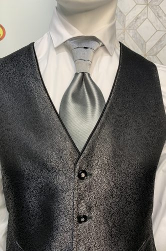 Chaleco de ceremonia fondo negro y estampado paisley en gris ceniza , espalda en raso liso gris ceniza.
