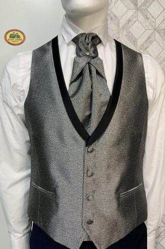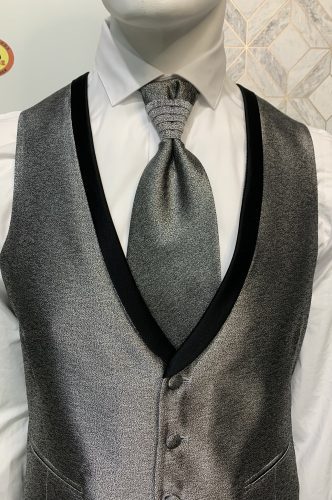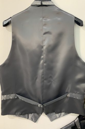 Chaleco de ceremonia fondo gris plata granulado , espalda en raso liso gris ceniza.